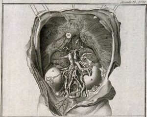 Anatomy of the abdomen (detail), showing the kidneys, the intestines, etc., after Albrecht von Haller (1708–1777). Engraving by Jacques Renaud Benard (1731–1794), late 18th century. (Wellcome Collection 35094i. Public domain.)